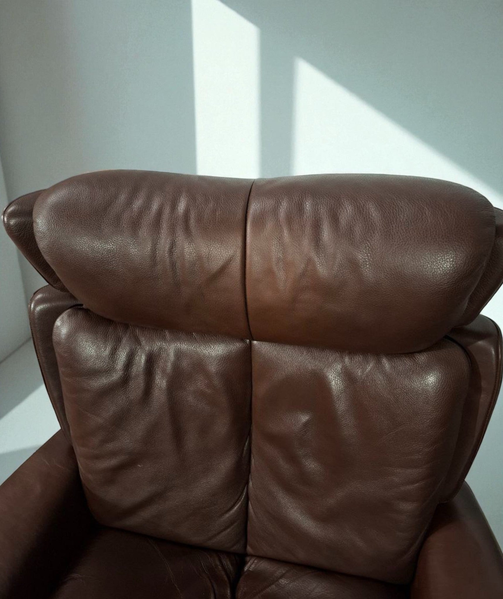 Stolen er godt brukt med noen få brukstegn. Det er noe misfarging på hodestøtten og et overfladisk merke nederst på siden av det ene armlenet (se bilder). Ellers fremstår stolen med krakk i god stand – alt fungerer som det skal. Stolen med krakk er profesjonelt rengjort, helt rene og klare for levering.