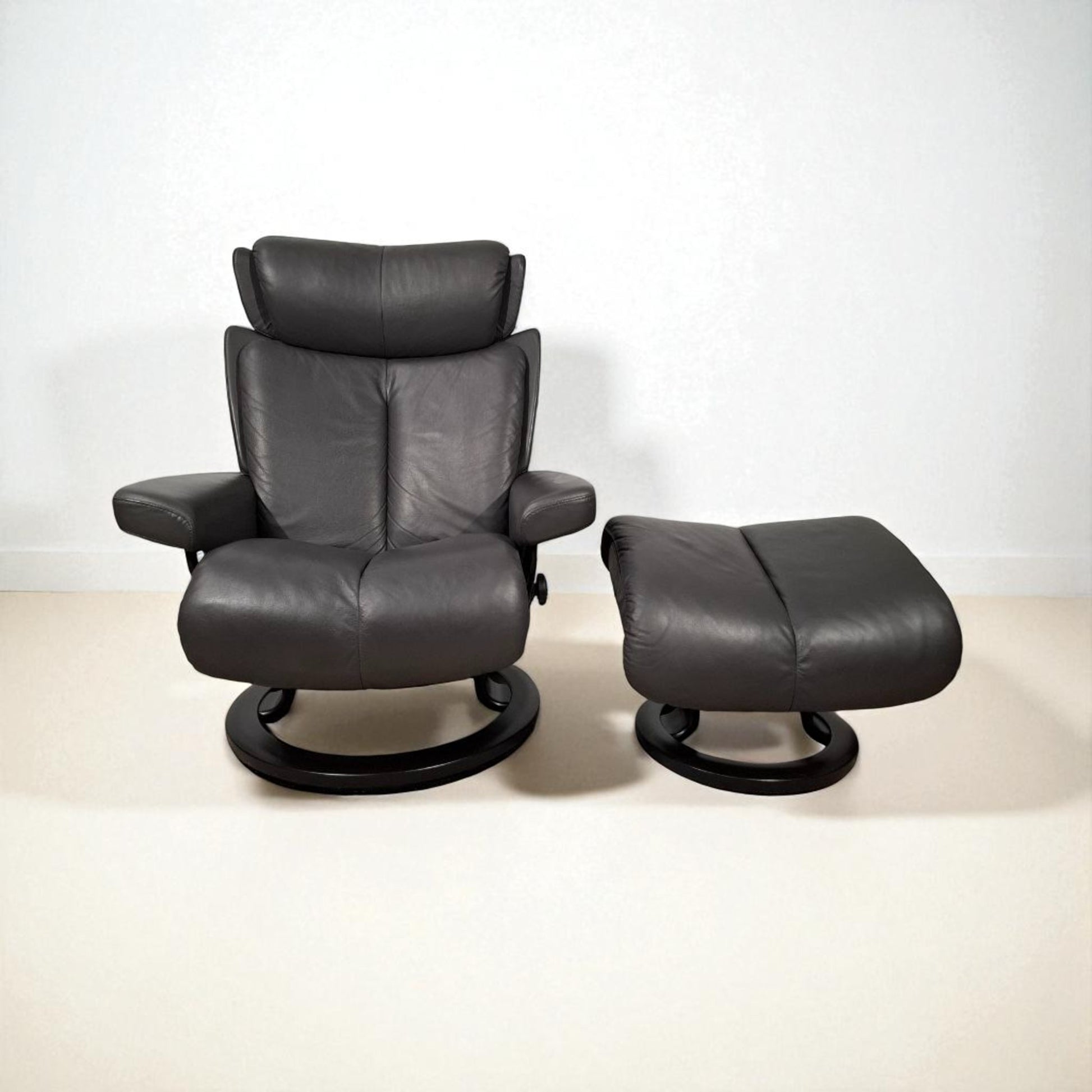 MøbelGlede tilbyr Stressless Magic i størelse(s) lenestol med krakk fra Ekornes. Stolen er trukket med grå kvalitet skinn.
