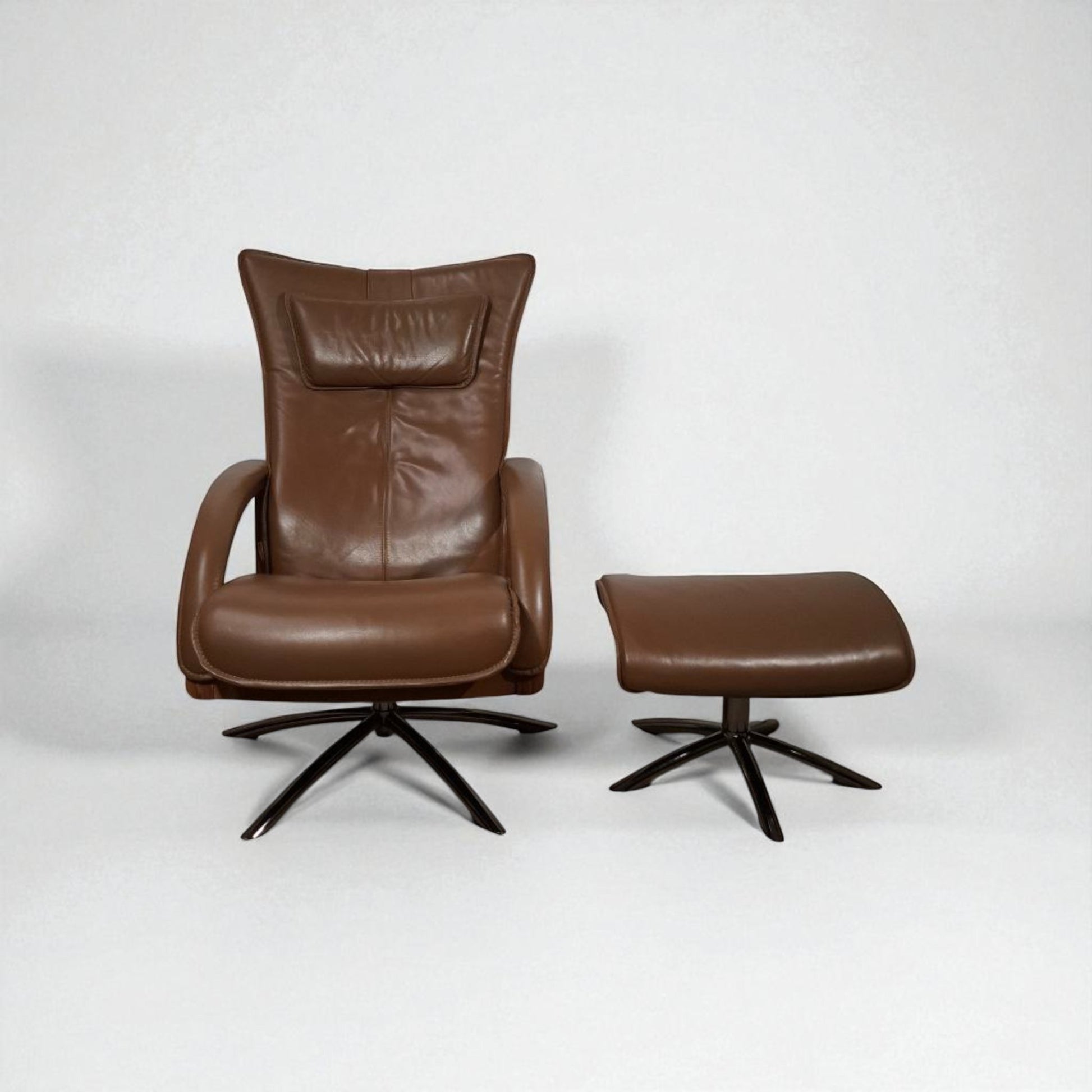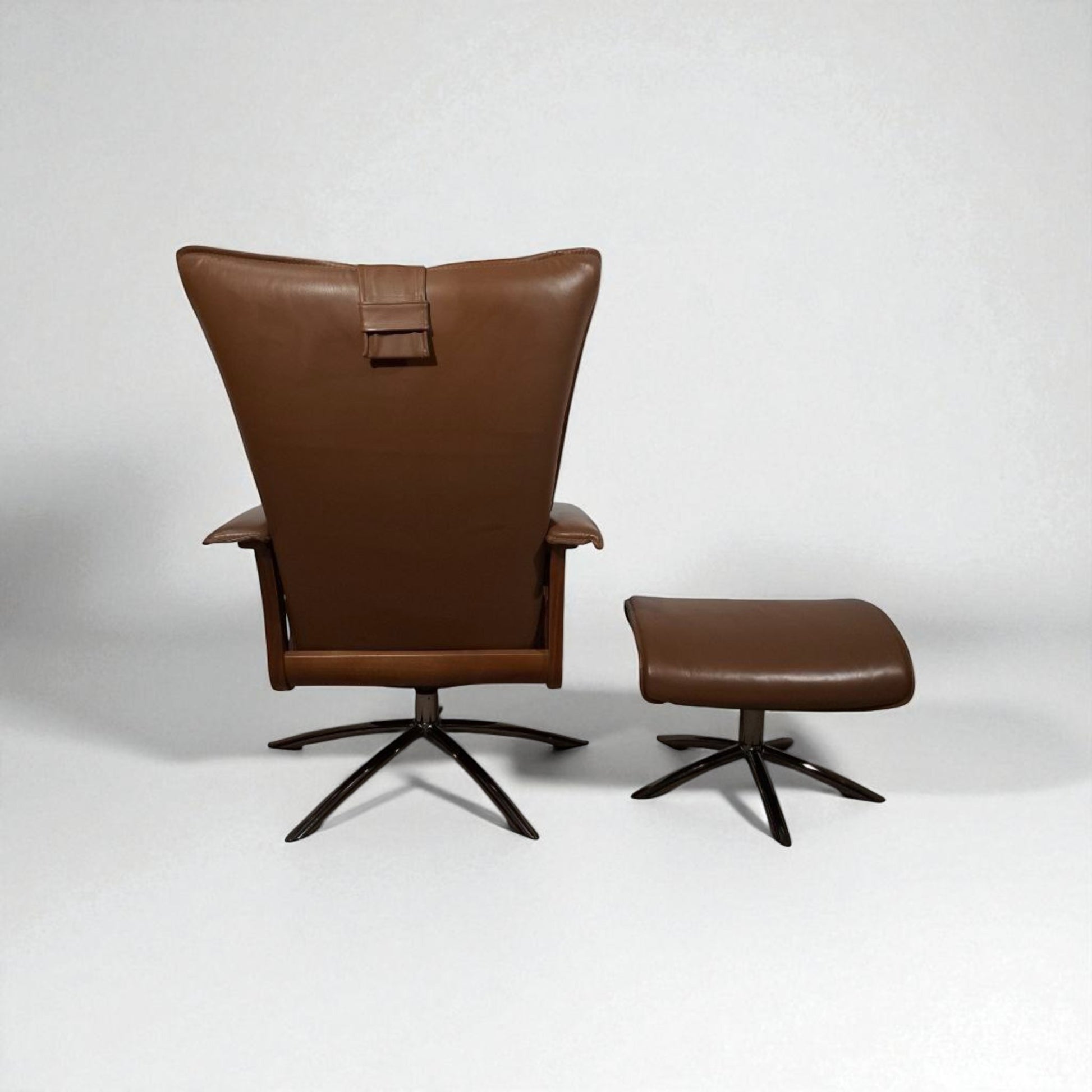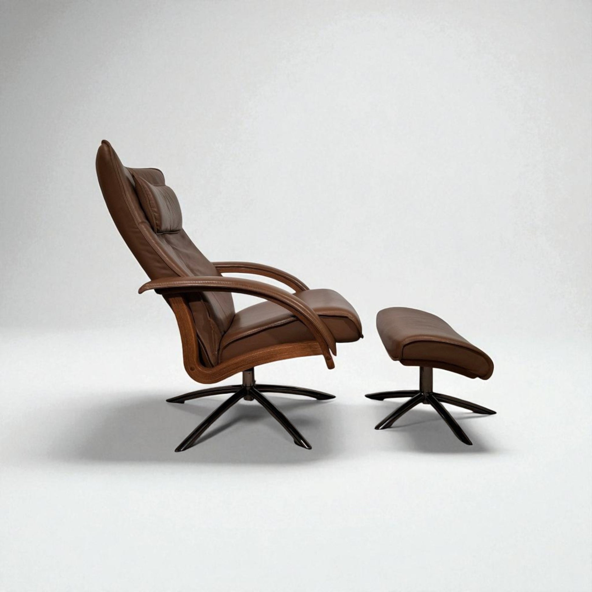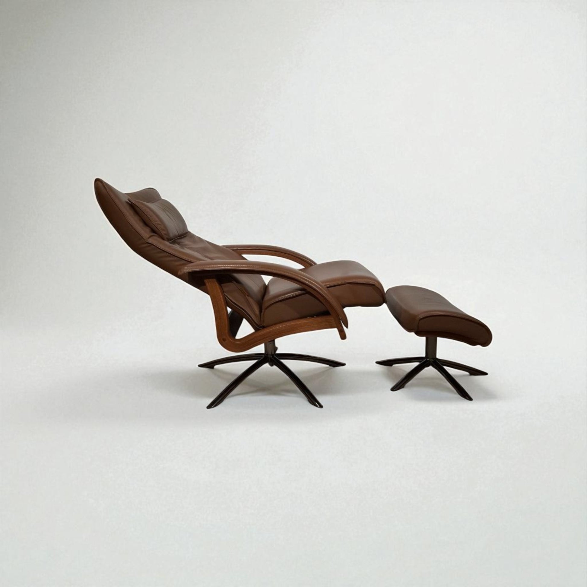 Delta Swing fra norske Brunstad har allerede blitt en kjent design. Dette settet inkluderer romslig lenestol og krakk i mørk brun høykvalitetsskinn.
