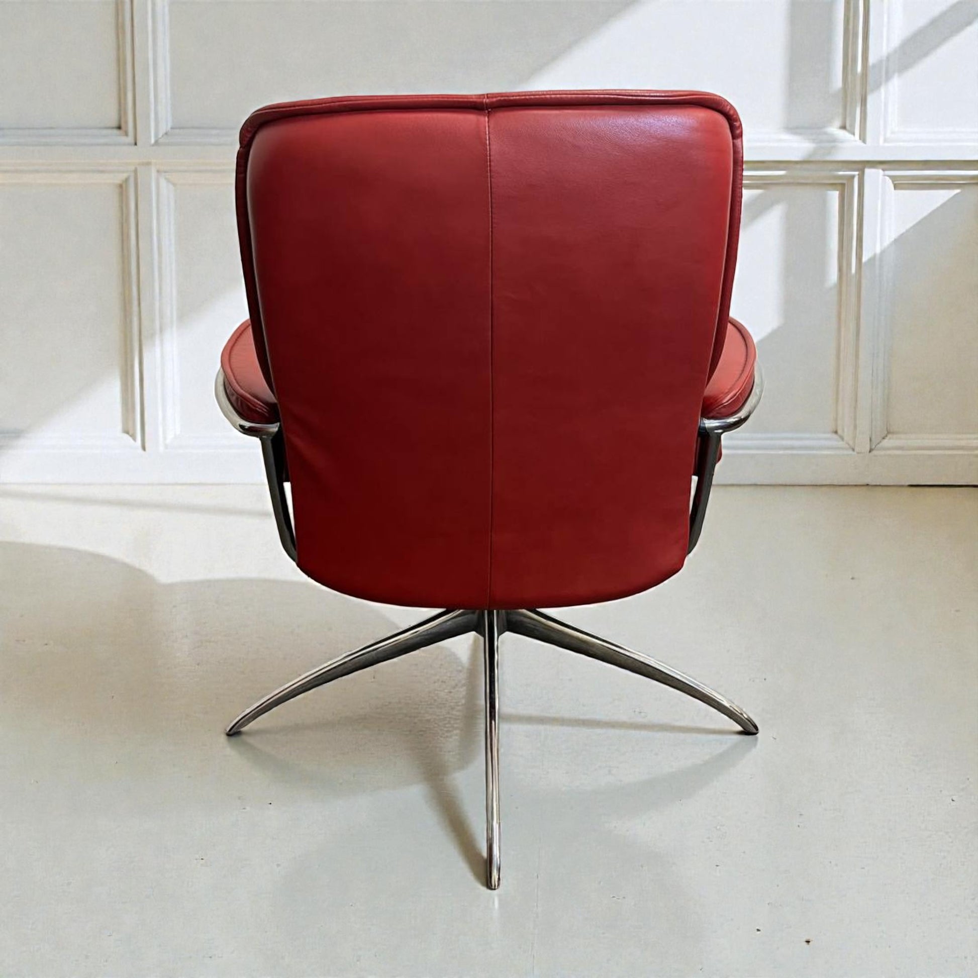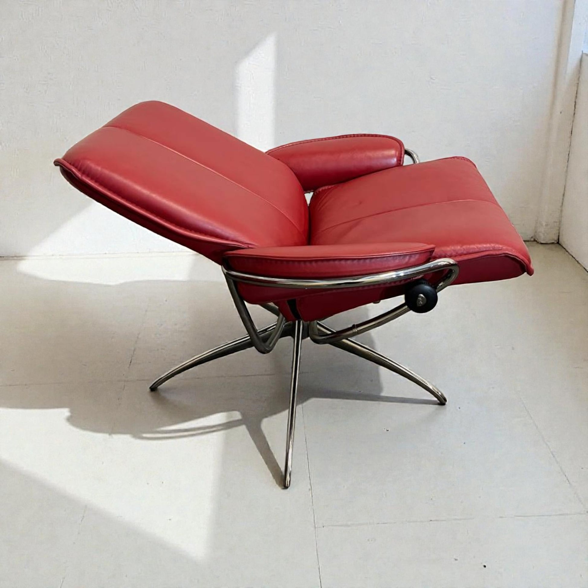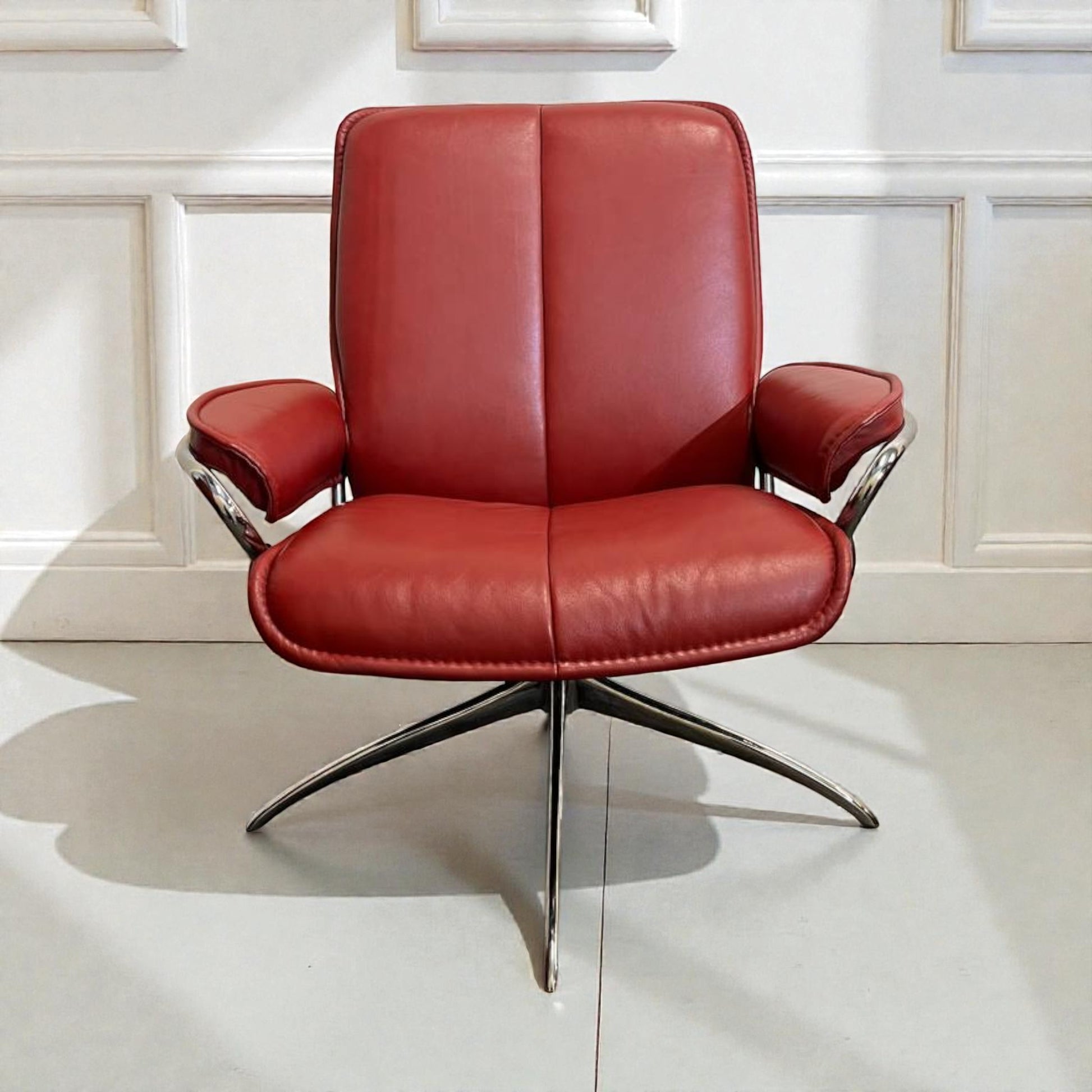 MøbelGlede tilbyr deg Stressless City Lav Rygg lenestol i elegant og romslig rød skinn, kjent for sin moderne komfort og luksuriøse opplevelse.