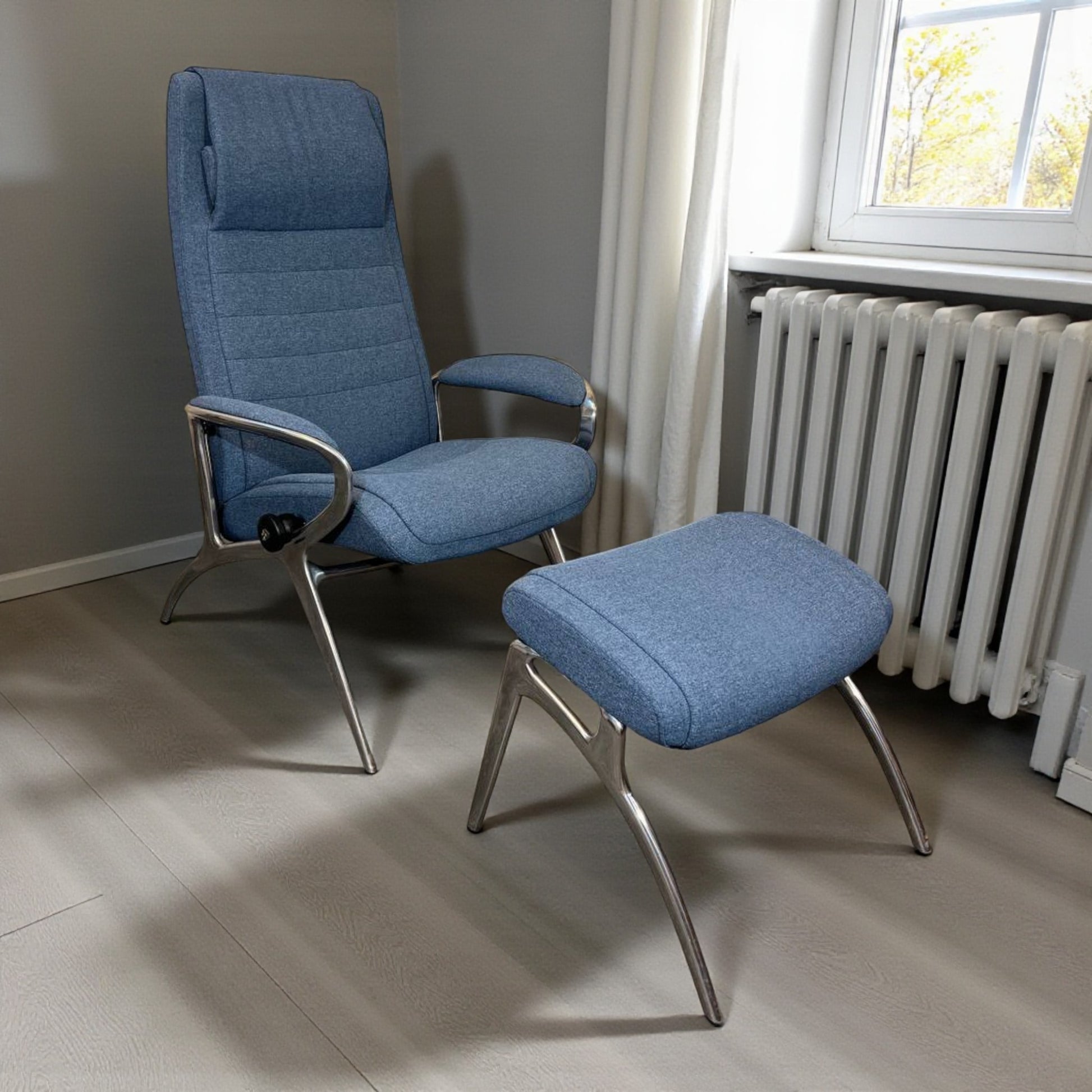 MøbelGlede tilbyr deg super komfortabel You James lenestol m/krakk fra Stressless Ekornes trukket i romslig blå stoff.
